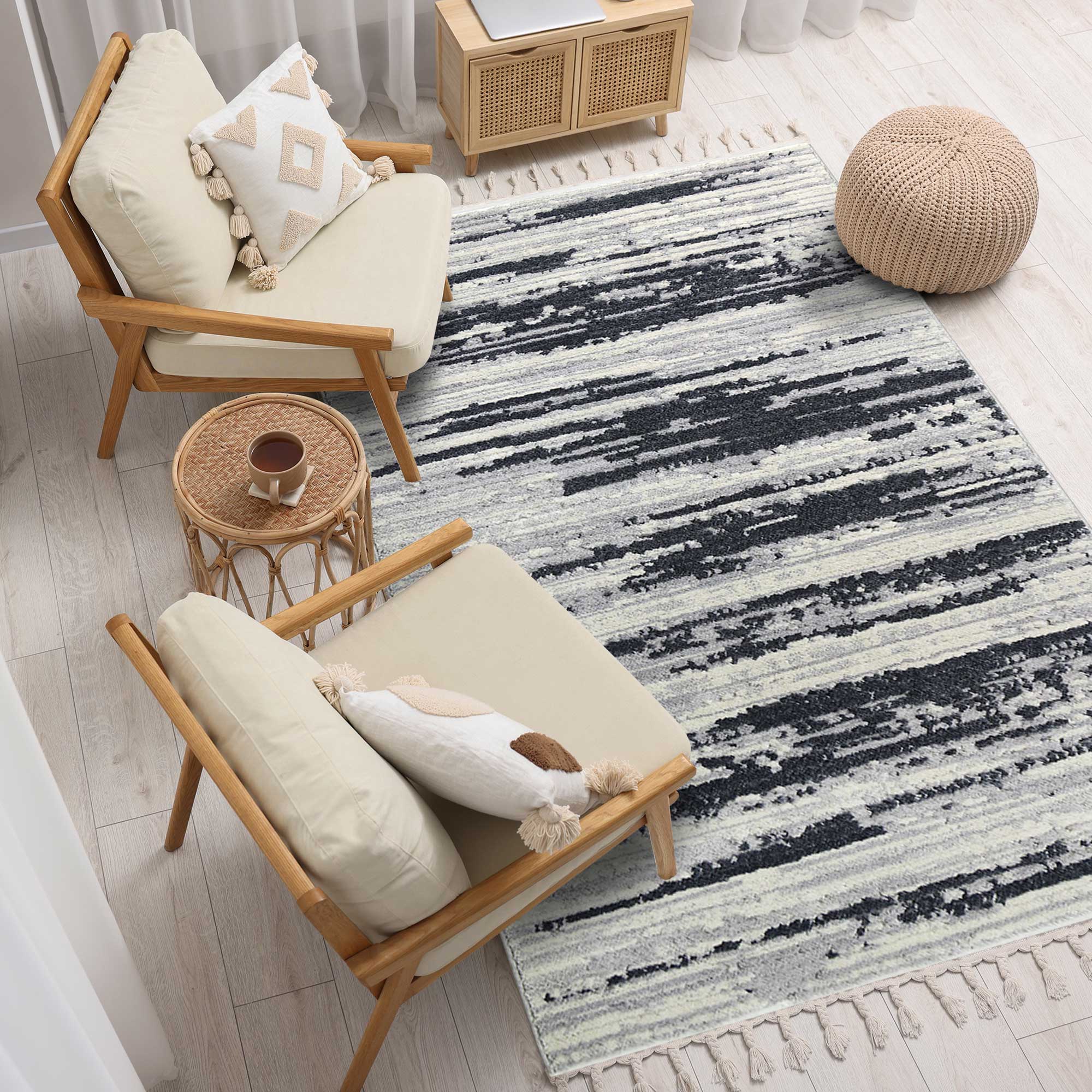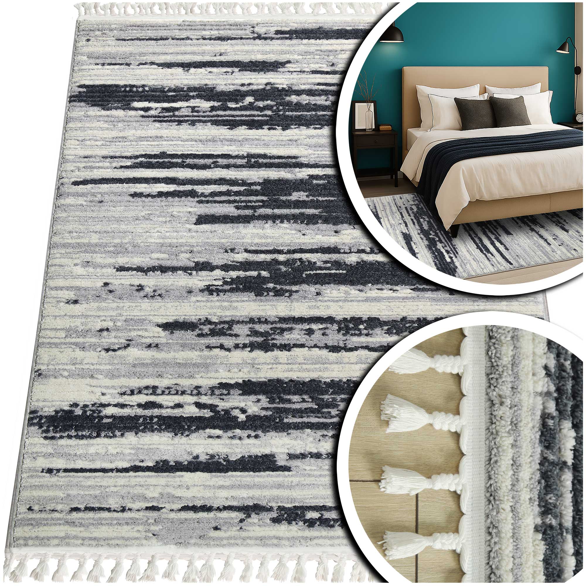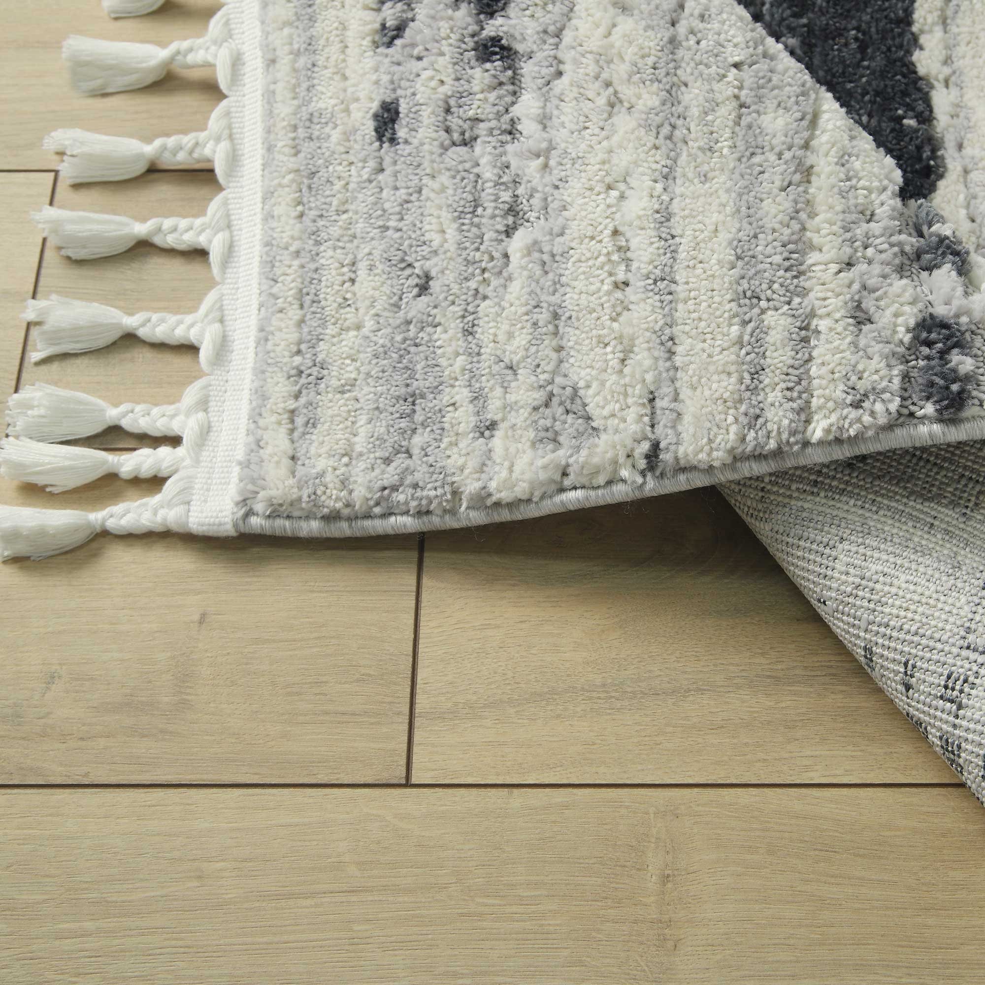 Długie plecione frędzle, a także różna wysokość runa tworząca efekt trójwymiaru 3d podkreślą styl i nada charakter Państwa mieszkaniu. Jednocześnie, dzięki stonowanym tonacjom kolorów, głównie szarości, beżu, kremu czy też domieszek czerni: