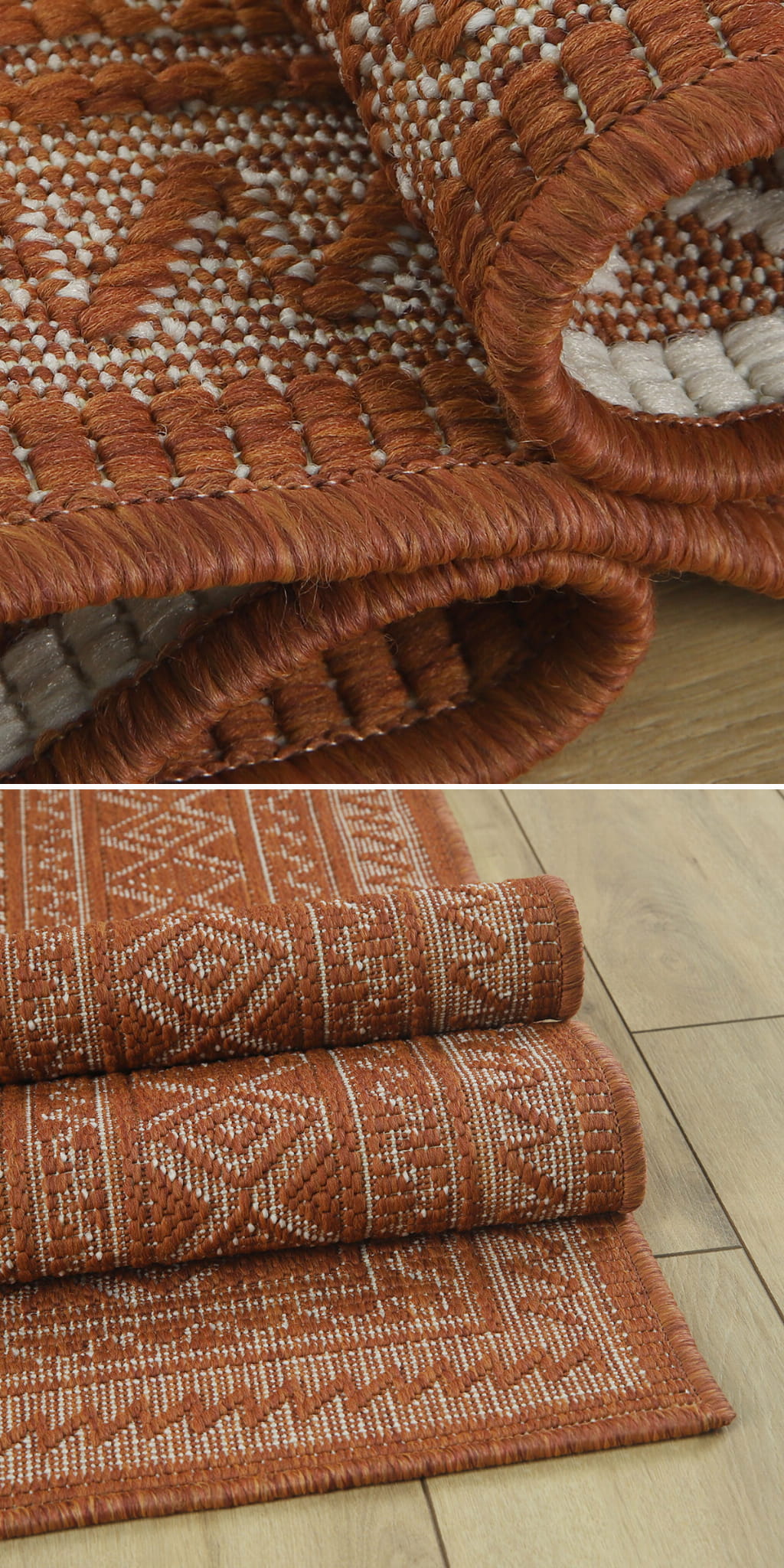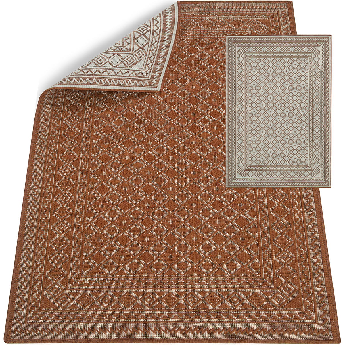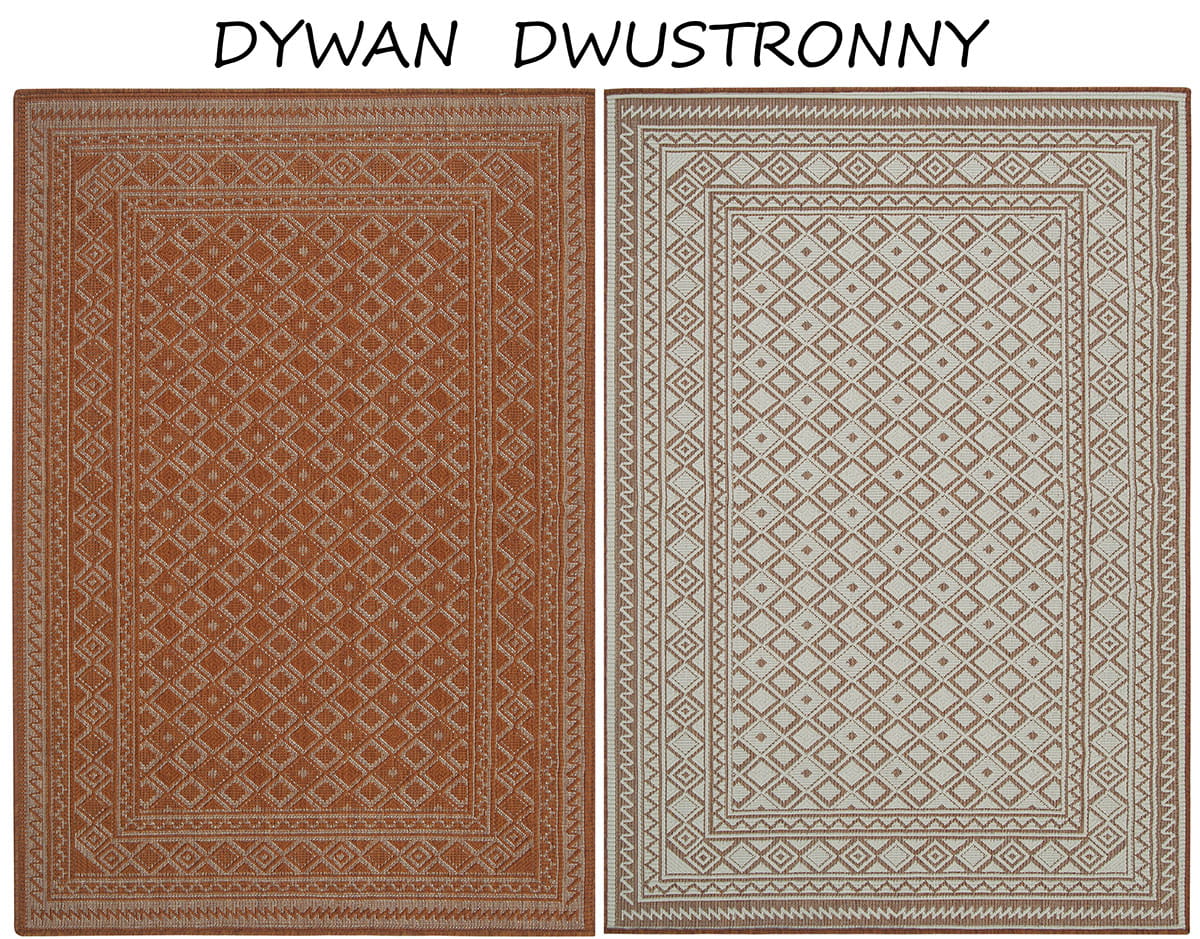 Główną zaletą tego typu dywanów jest to, iż można je wykorzystać na zewnątrz i wewnątrz oraz możliwość zastosowania ich w dwóch wersjach kolorystycznych ponieważ są to dywany dwustronne.