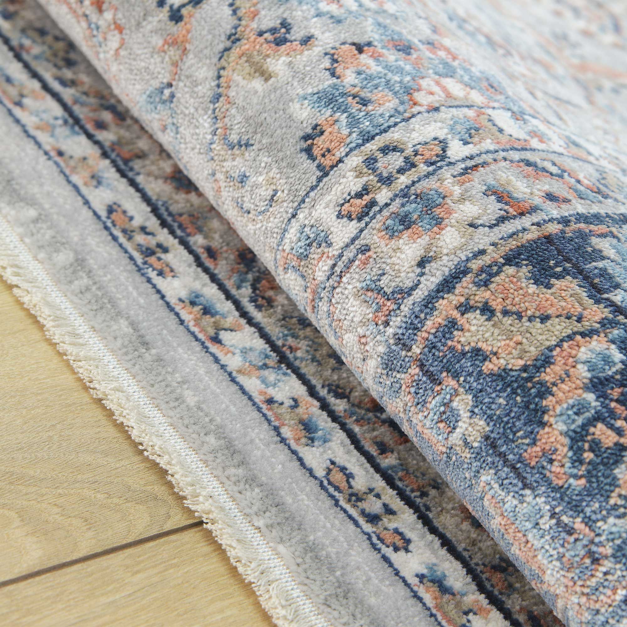 Kolekcja zachwyca subtelnym połyskiem, dzięki czemu przepięknie zmieniają się pod wpływem światła. Delikatne frędzle (ok. 12 mm) dodają dywanom lekkości i klasy, tworząc efekt dekoracyjny, który przyciąga wzrok.