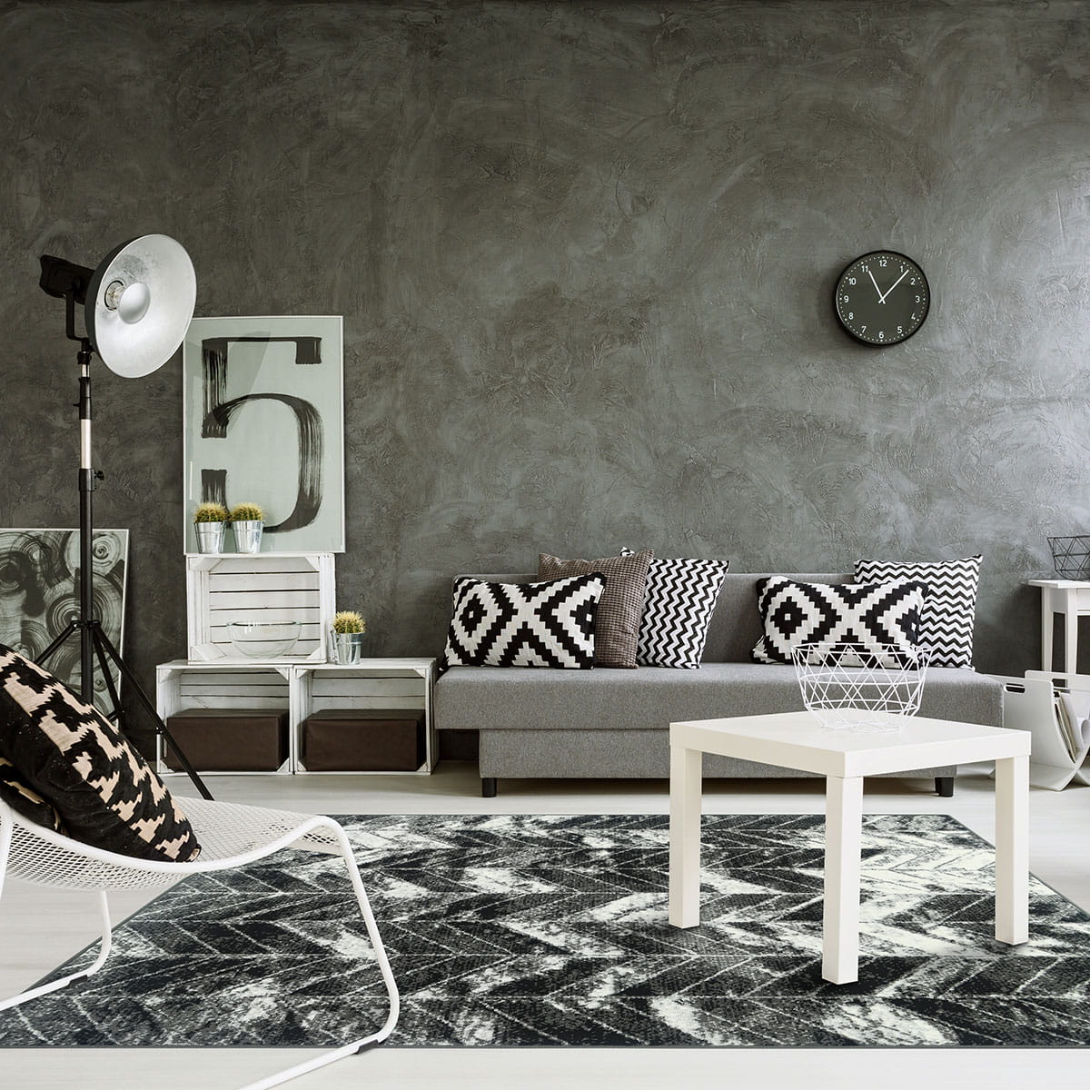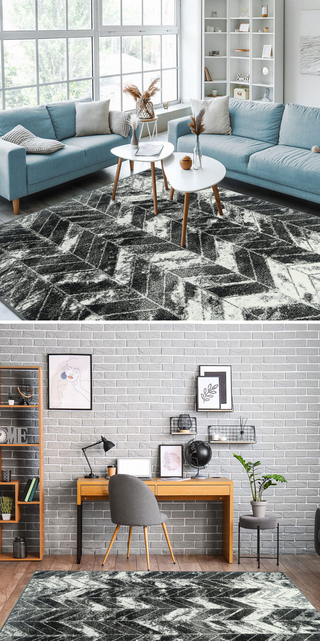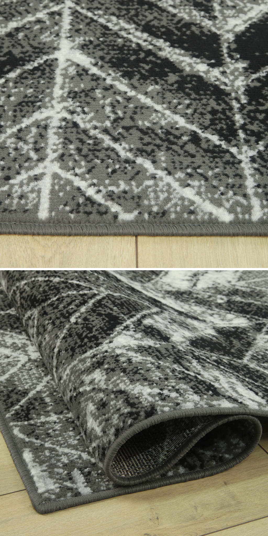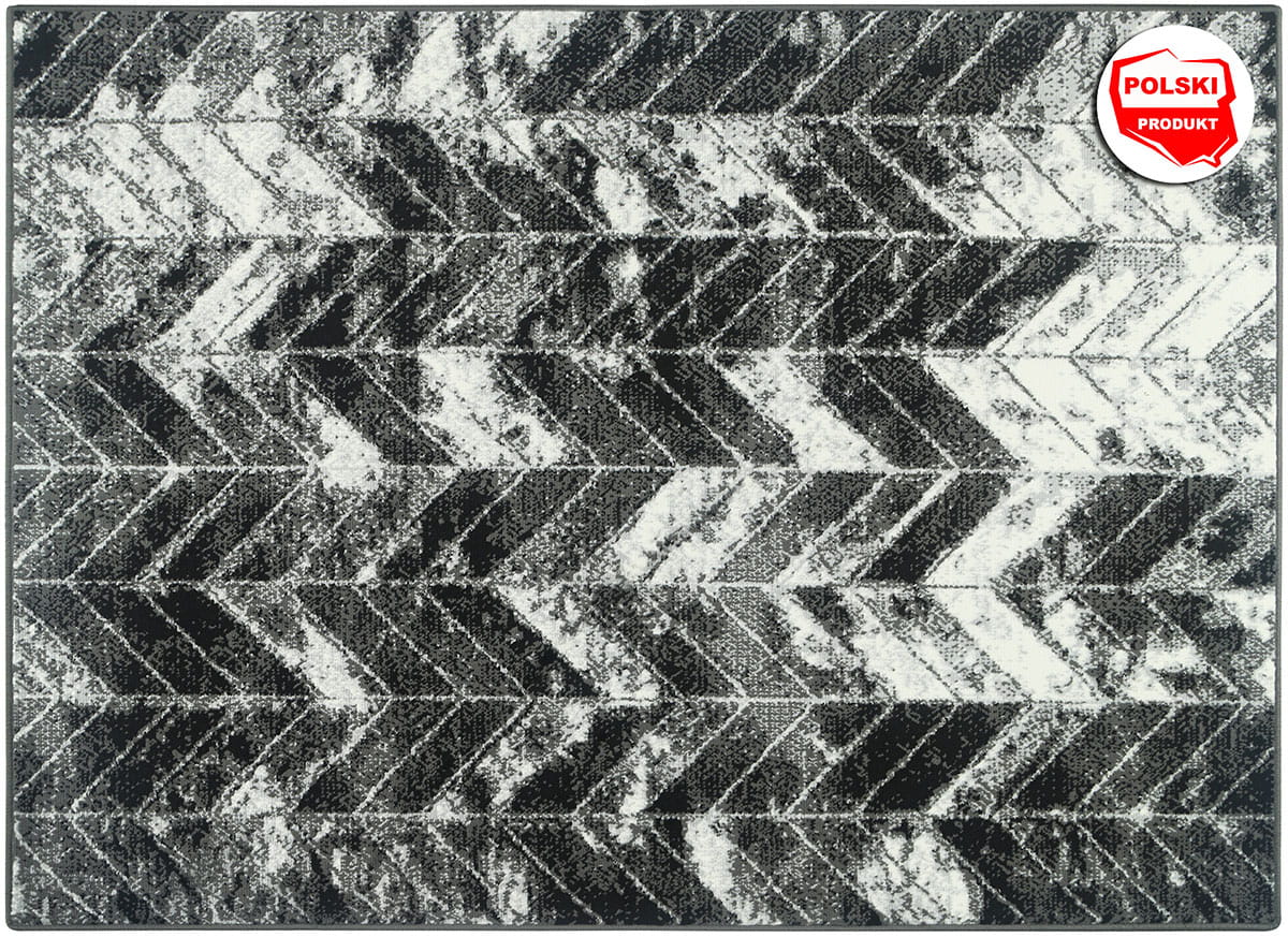 Abstrakcyjny wzór dywanu z KOLEKCJI GRAFICA oraz zróżnicowana tonacja szarości z domieszką czerni i bieli, umiejętnie podkreśli styl i nada charakter Państwa mieszkaniu.