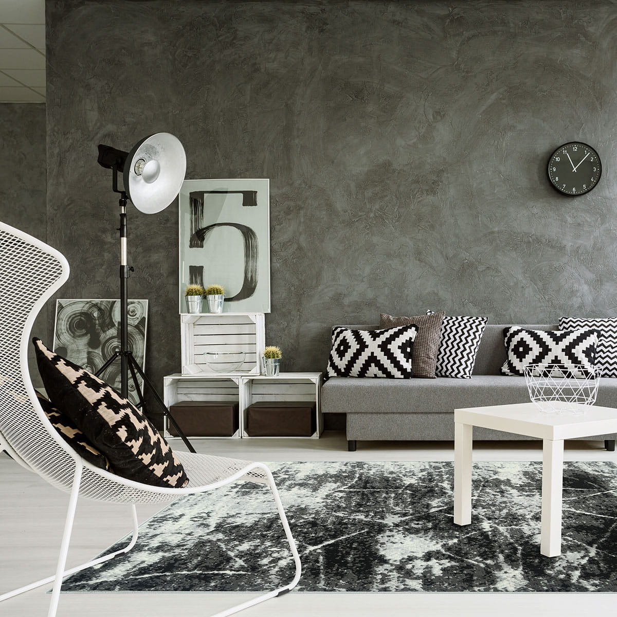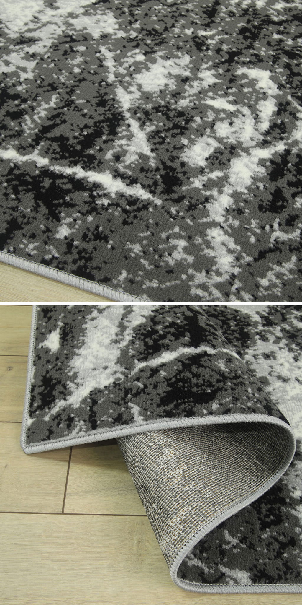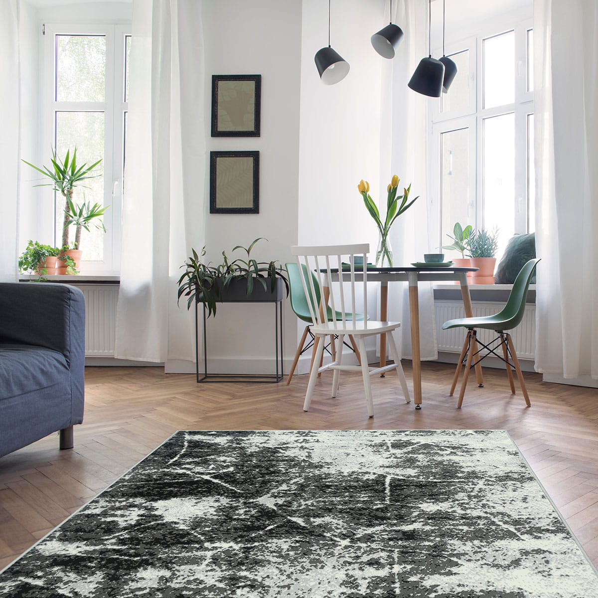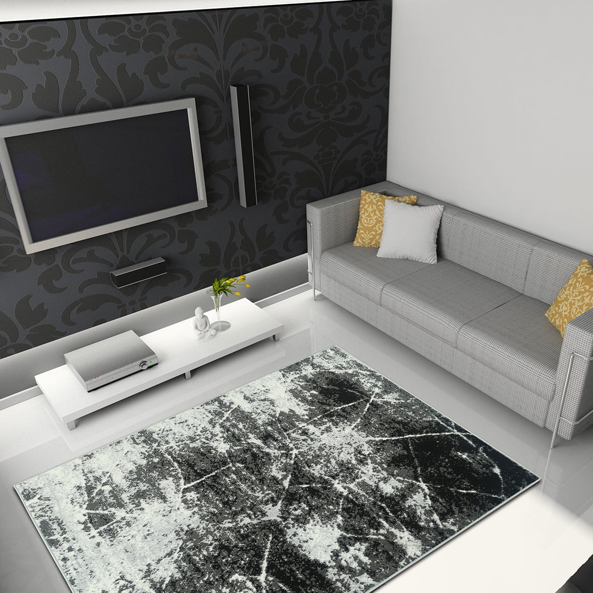 Abstrakcyjny wzór dywanu z KOLEKCJI GRAFICA oraz zróżnicowana tonacja szarości z domieszką czerni i bieli, umiejętnie podkreśli styl i nada charakter Państwa mieszkaniu.