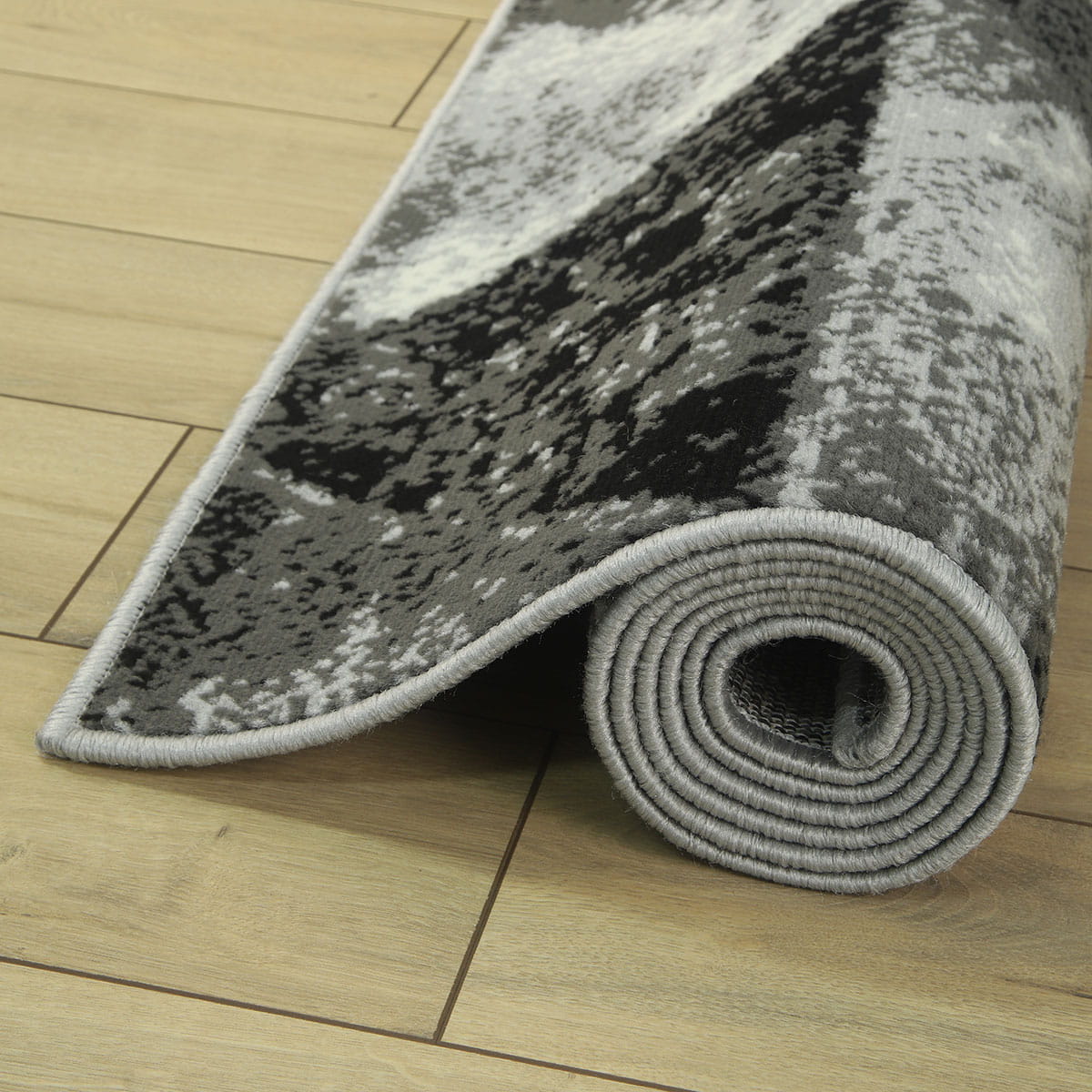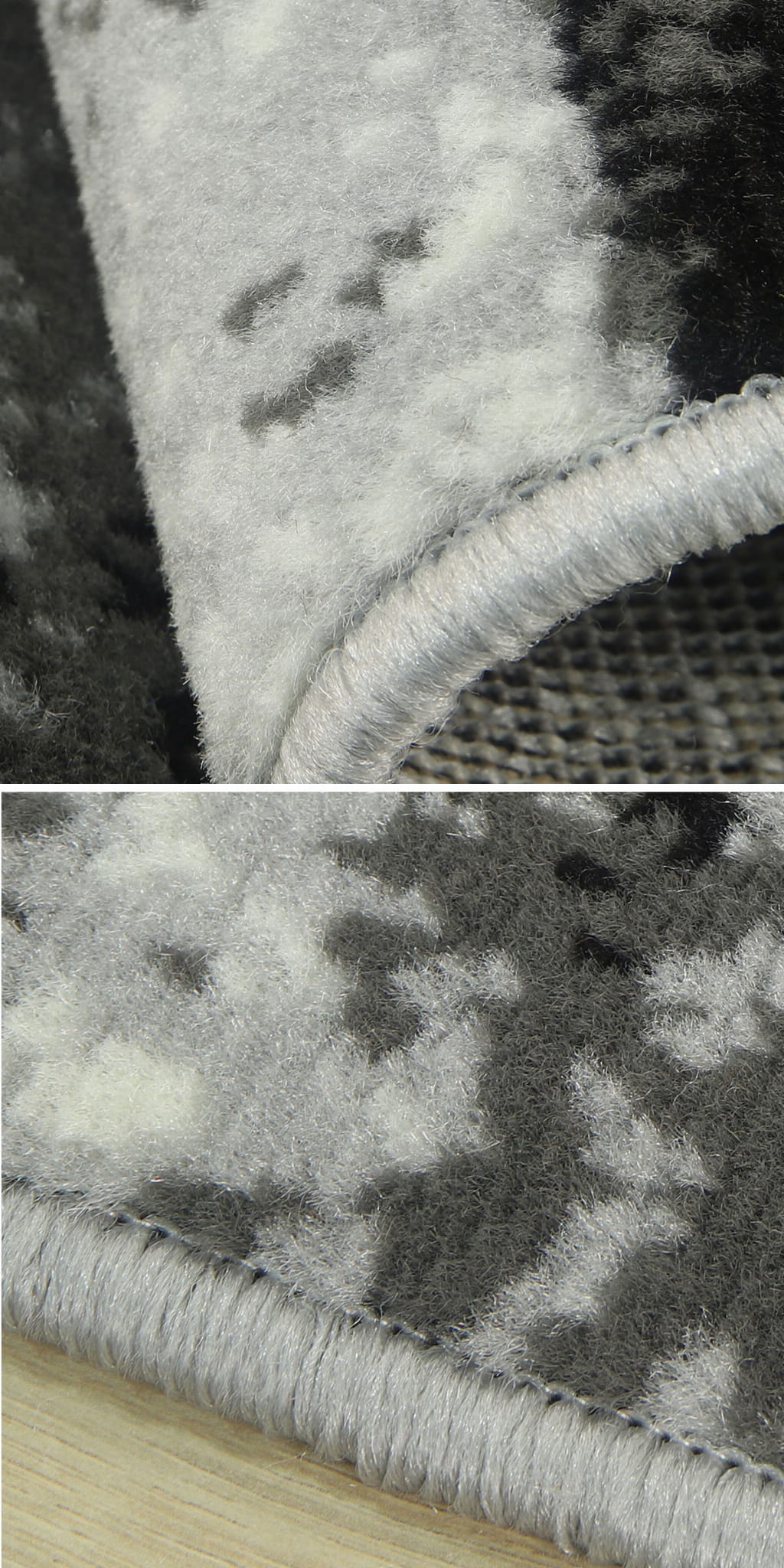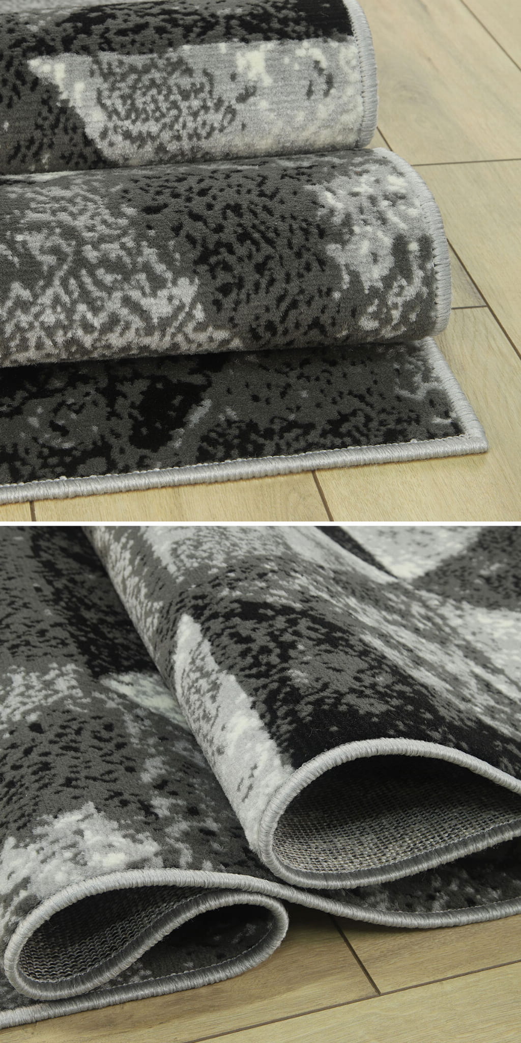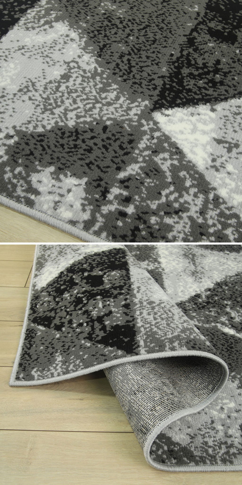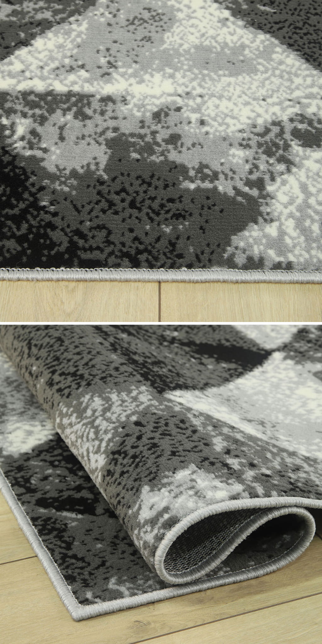 Abstrakcyjny wzór dywanu z KOLEKCJI GRAFICA oraz zróżnicowana tonacja szarości z domieszką czerni i bieli, umiejętnie podkreśli styl i nada charakter Państwa mieszkaniu.