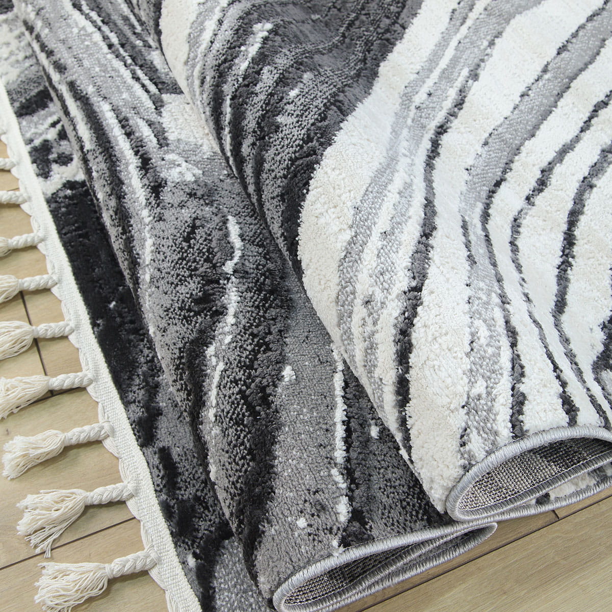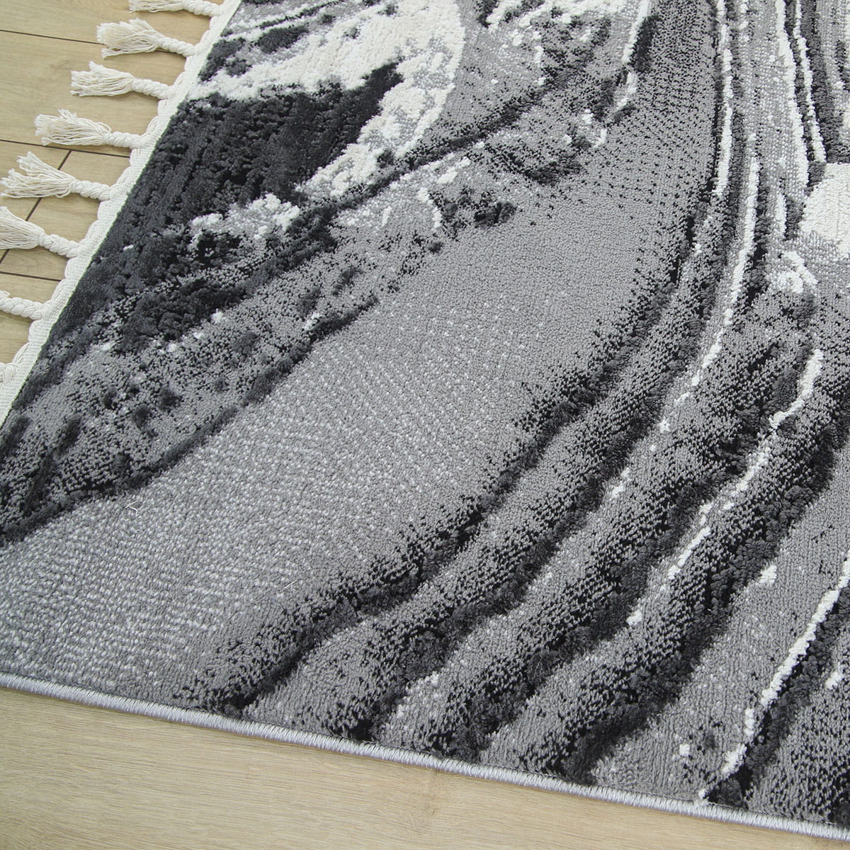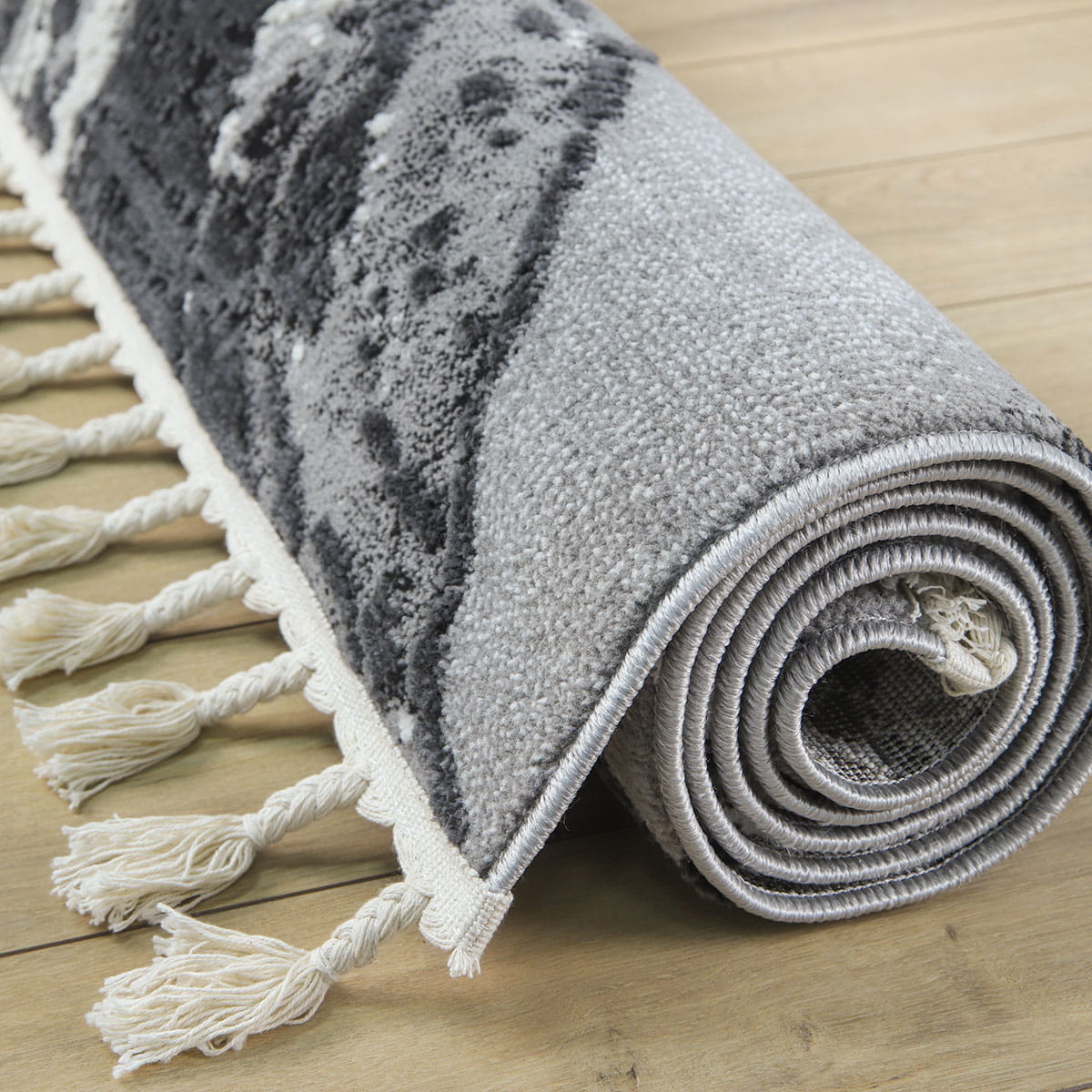 Wchodząc na ten dywan, poczujesz miękkość pod stopami, która otuli Cię przyjemnym ciepłem. Runo o różnej wysokości nie tylko zapewnia niesamowity komfort, ale również dodaje tekstury i głębi. Dodatkowo, dywany te lekko połyskują w zależności od ułożenia runa i kąta padania światła, co nadaje im elegancji i sprawia, że wyglądają jeszcze bardziej luksusowo. Frędzle dopełniają całość, podkreślając wyjątkowy charakter dywanu.