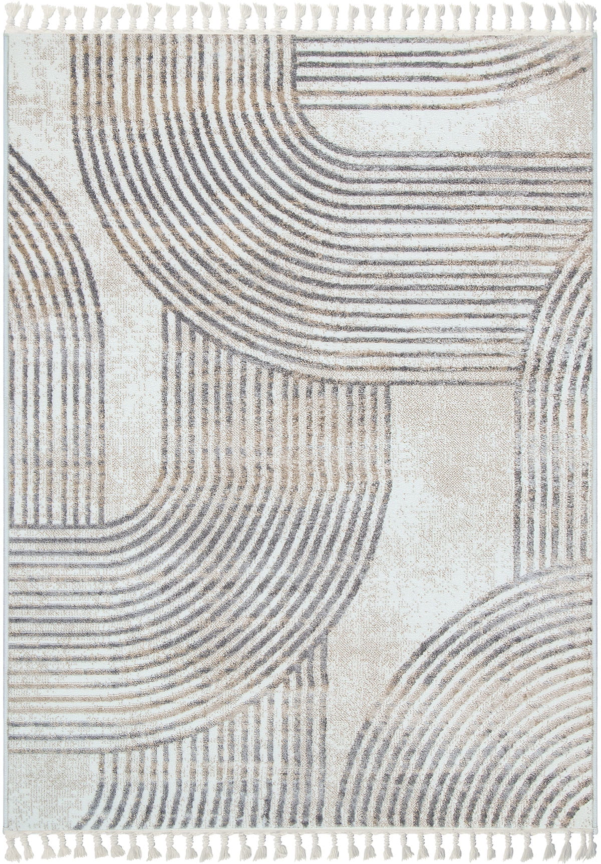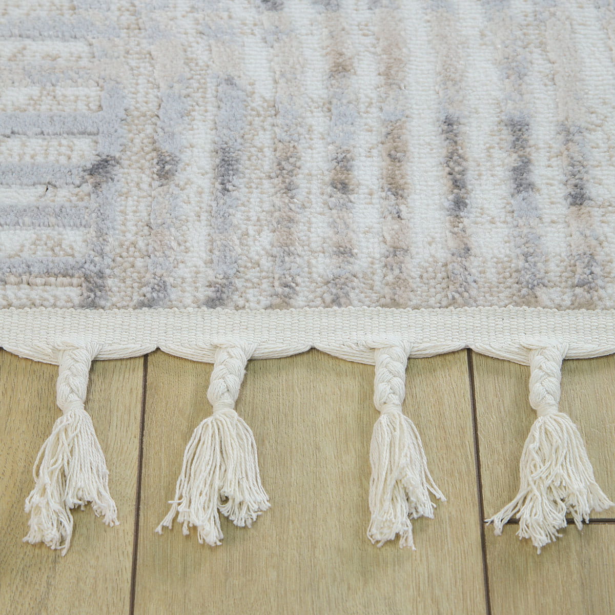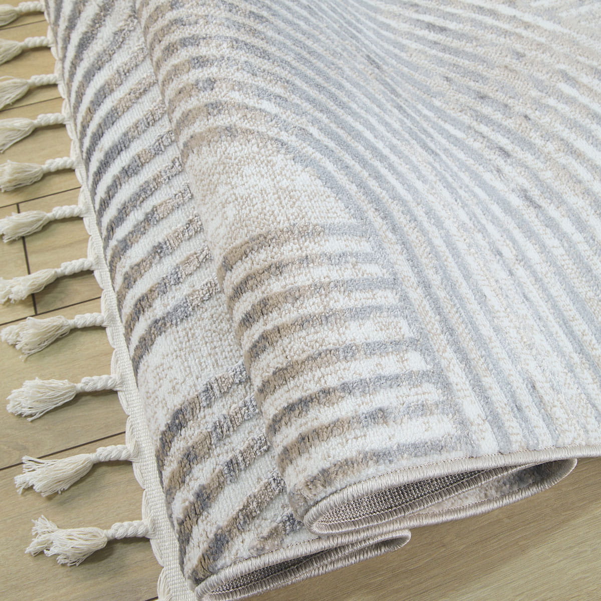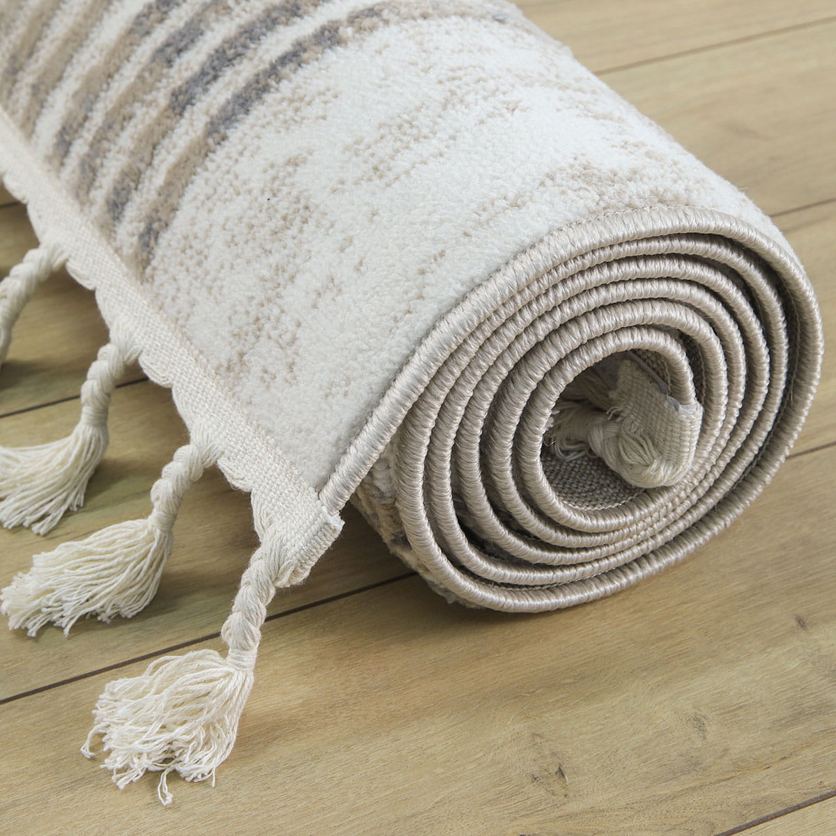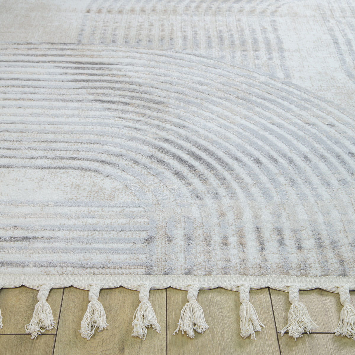 Wchodząc na ten dywan, poczujesz miękkość pod stopami, która otuli Cię przyjemnym ciepłem. Runo o różnej wysokości nie tylko zapewnia niesamowity komfort, ale również dodaje tekstury i głębi. Dodatkowo, dywany te lekko połyskują w zależności od ułożenia runa i kąta padania światła, co nadaje im elegancji i sprawia, że wyglądają jeszcze bardziej luksusowo. Frędzle dopełniają całość, podkreślając wyjątkowy charakter dywanu.