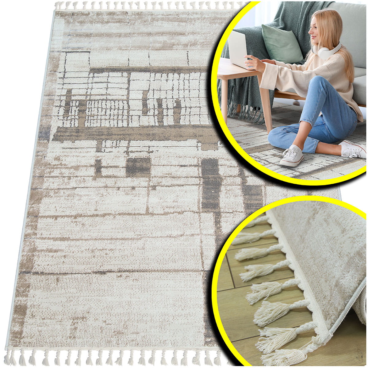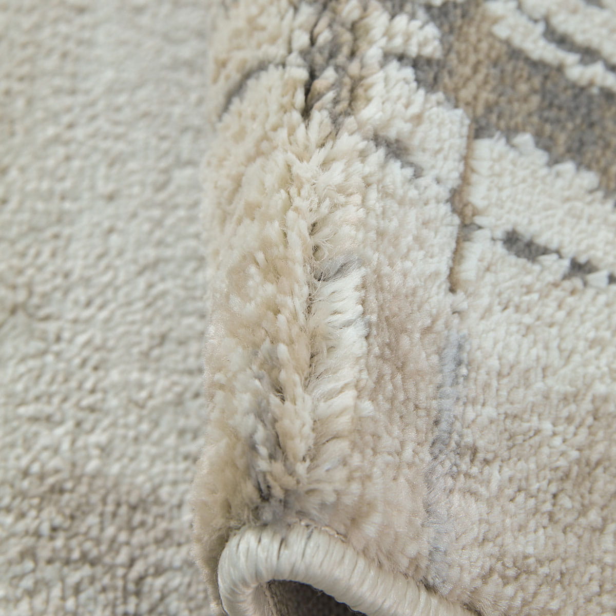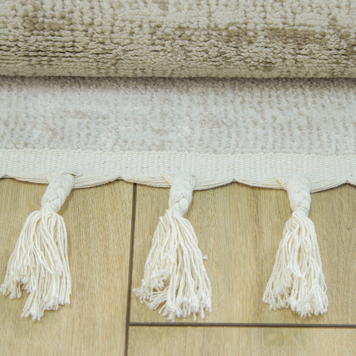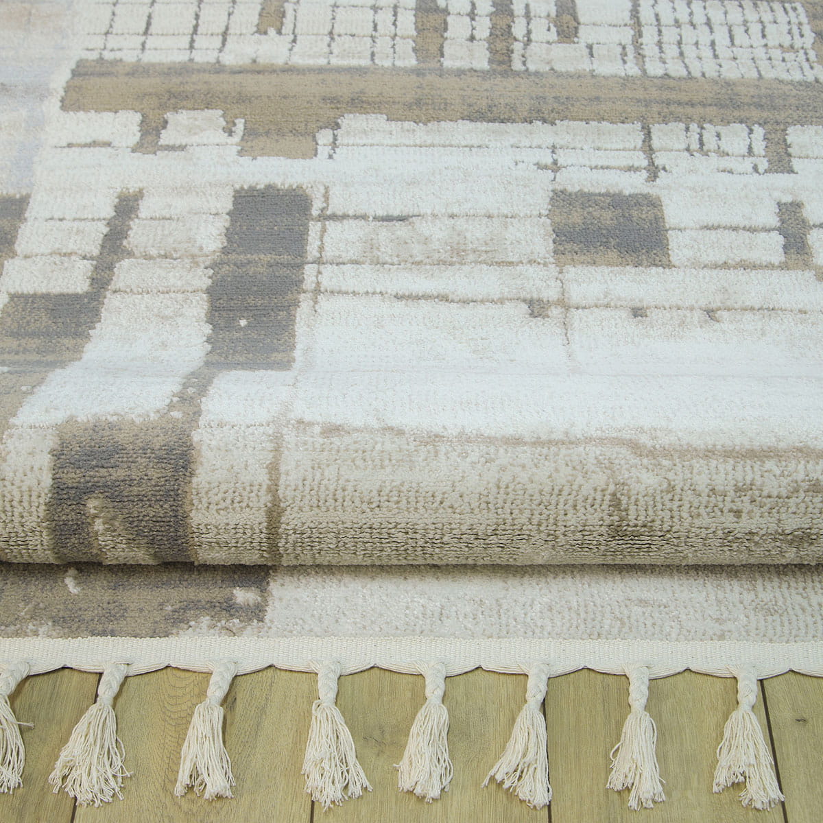 Wchodząc na ten dywan, poczujesz miękkość pod stopami, która otuli Cię przyjemnym ciepłem. Runo o różnej wysokości nie tylko zapewnia niesamowity komfort, ale również dodaje tekstury i głębi. Dodatkowo, dywany te lekko połyskują w zależności od ułożenia runa i kąta padania światła, co nadaje im elegancji i sprawia, że wyglądają jeszcze bardziej luksusowo. Frędzle dopełniają całość, podkreślając wyjątkowy charakter dywanu.