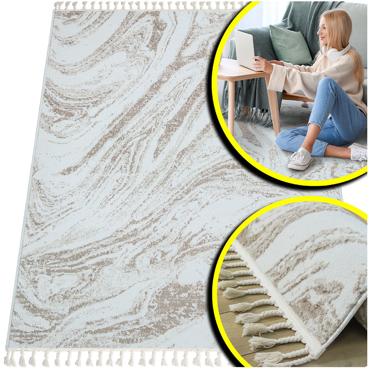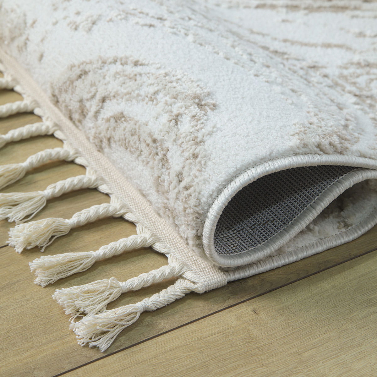 Wchodząc na ten dywan, poczujesz miękkość pod stopami, która otuli Cię przyjemnym ciepłem. Runo o różnej wysokości nie tylko zapewnia niesamowity komfort, ale również dodaje tekstury i głębi. Dodatkowo, dywany te lekko połyskują w zależności od ułożenia runa i kąta padania światła, co nadaje im elegancji i sprawia, że wyglądają jeszcze bardziej luksusowo. Frędzle dopełniają całość, podkreślając wyjątkowy charakter dywanu.