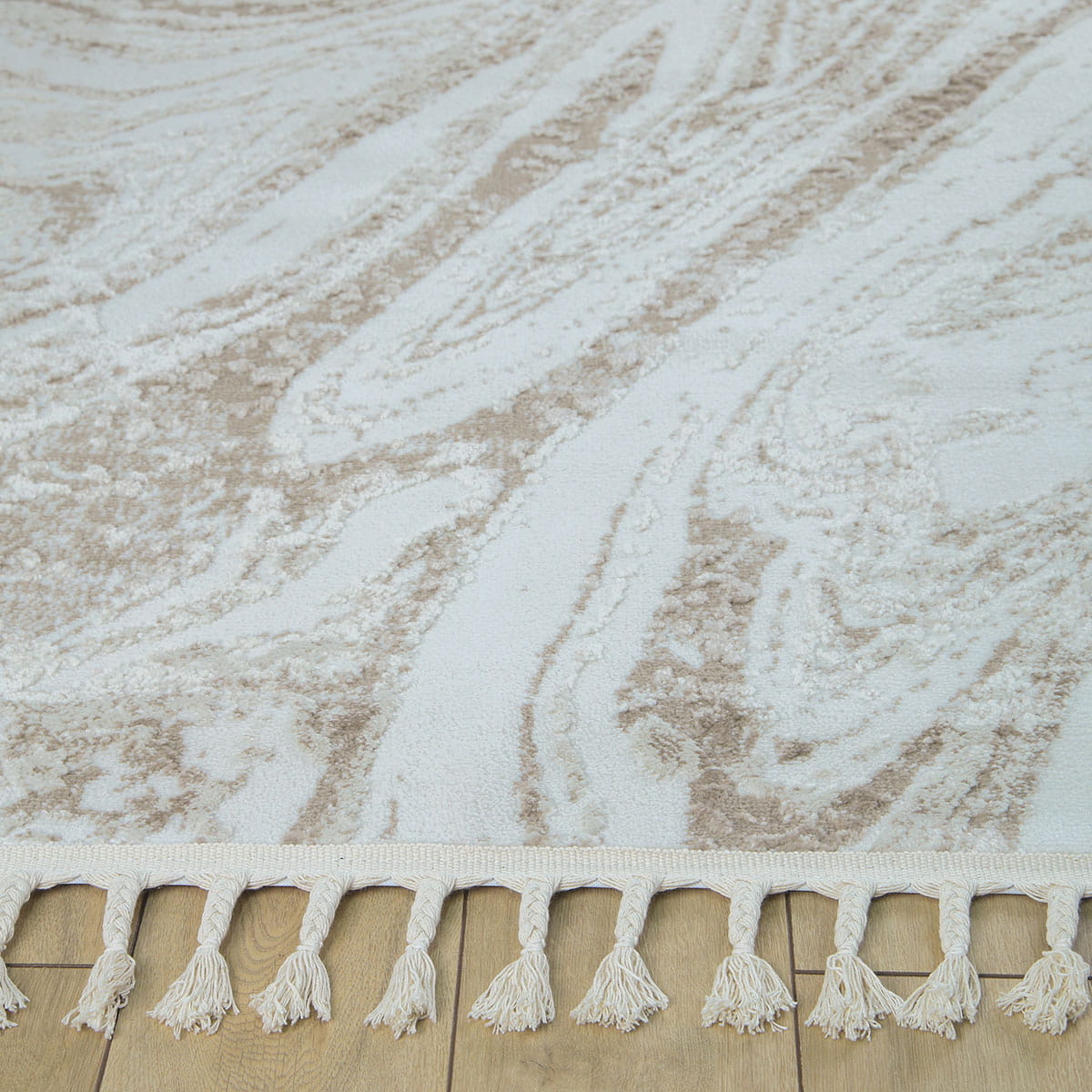 Wchodząc na ten dywan, poczujesz miękkość pod stopami, która otuli Cię przyjemnym ciepłem. Runo o różnej wysokości nie tylko zapewnia niesamowity komfort, ale również dodaje tekstury i głębi. Dodatkowo, dywany te lekko połyskują w zależności od ułożenia runa i kąta padania światła, co nadaje im elegancji i sprawia, że wyglądają jeszcze bardziej luksusowo. Frędzle dopełniają całość, podkreślając wyjątkowy charakter dywanu.