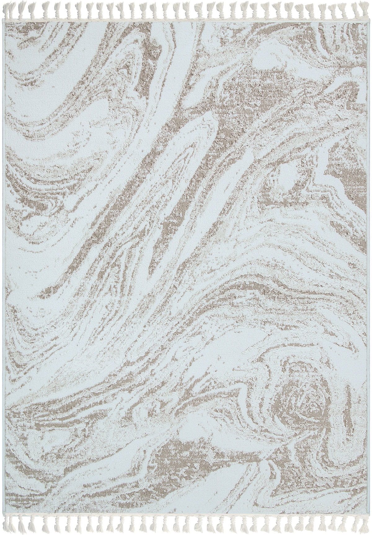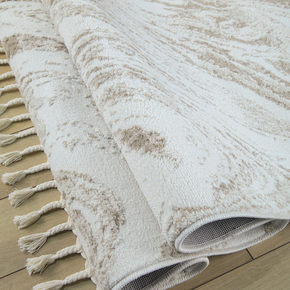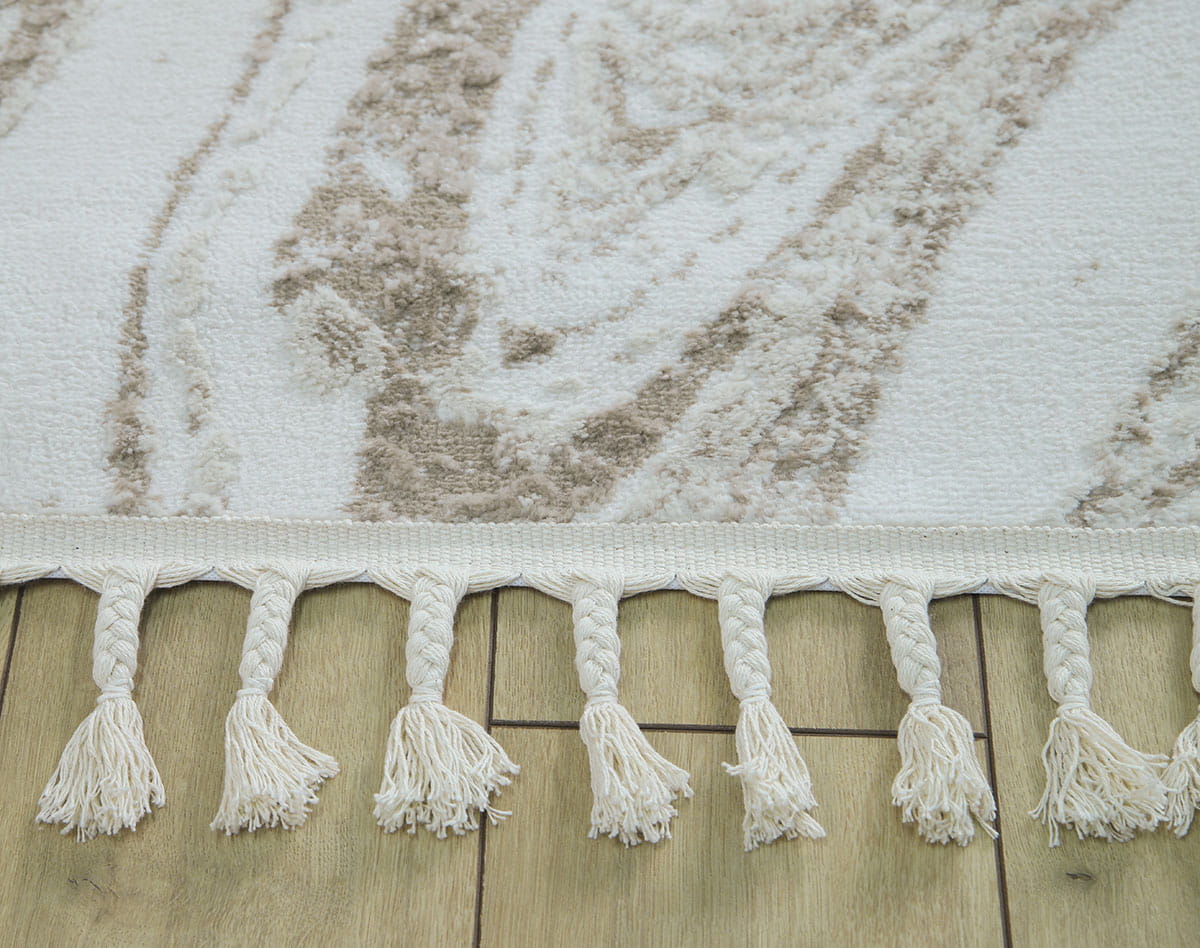 Wchodząc na ten dywan, poczujesz miękkość pod stopami, która otuli Cię przyjemnym ciepłem. Runo o różnej wysokości nie tylko zapewnia niesamowity komfort, ale również dodaje tekstury i głębi. Dodatkowo, dywany te lekko połyskują w zależności od ułożenia runa i kąta padania światła, co nadaje im elegancji i sprawia, że wyglądają jeszcze bardziej luksusowo. Frędzle dopełniają całość, podkreślając wyjątkowy charakter dywanu.