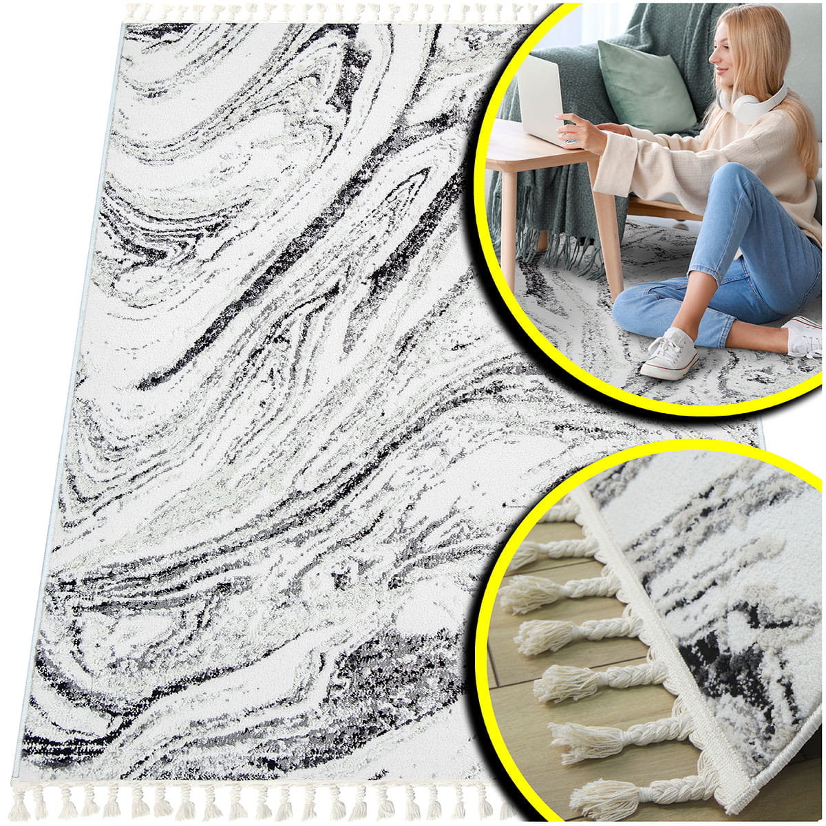 Wchodząc na ten dywan, poczujesz miękkość pod stopami, która otuli Cię przyjemnym ciepłem. Runo o różnej wysokości nie tylko zapewnia niesamowity komfort, ale również dodaje tekstury i głębi. Dodatkowo, dywany te lekko połyskują w zależności od ułożenia runa i kąta padania światła, co nadaje im elegancji i sprawia, że wyglądają jeszcze bardziej luksusowo. Frędzle dopełniają całość, podkreślając wyjątkowy charakter dywanu.