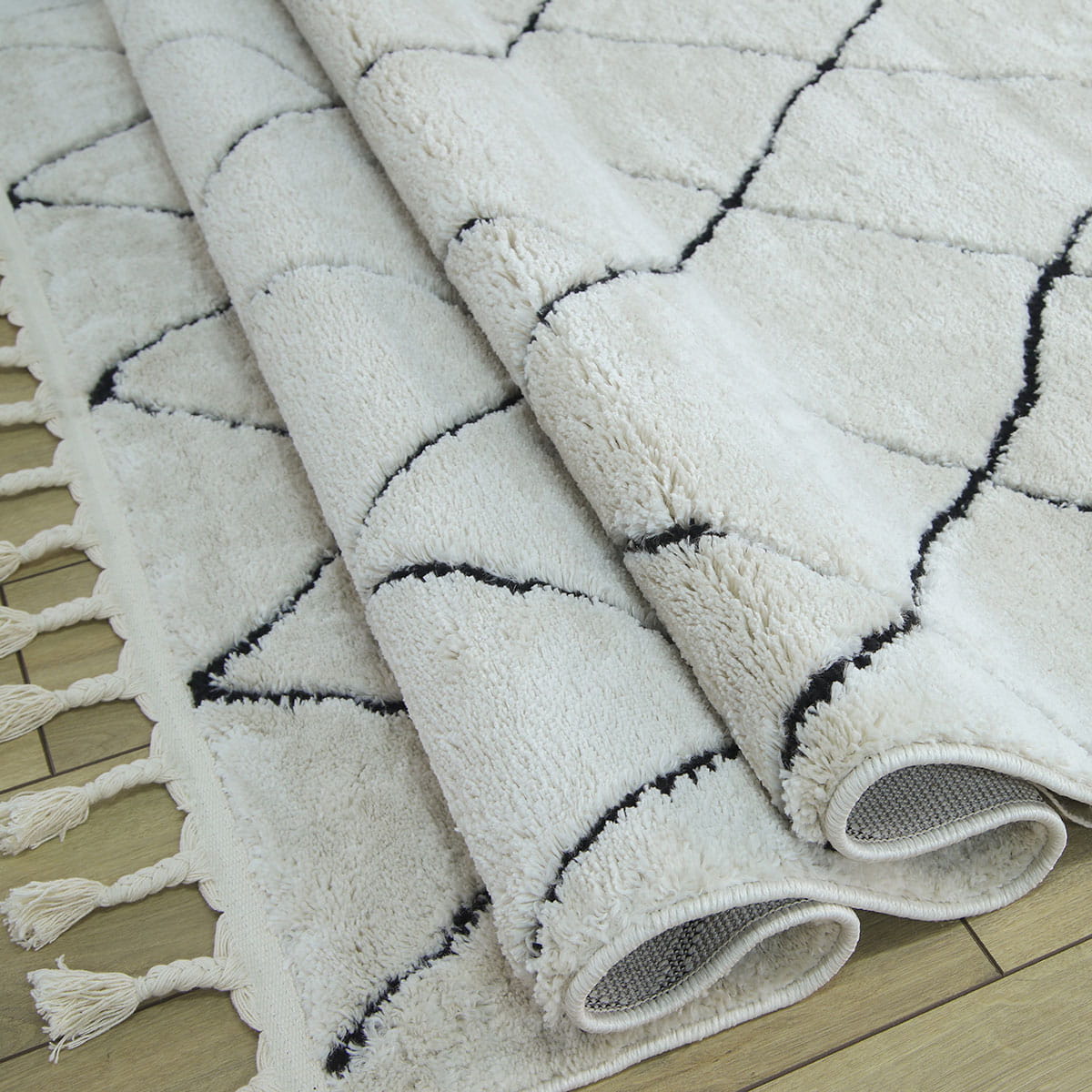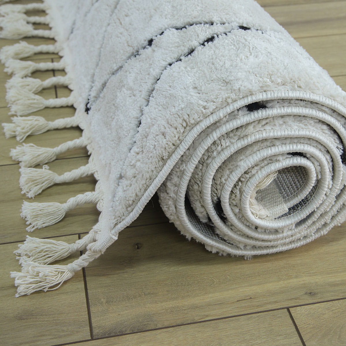 Wchodząc na ten dywan, poczujesz miękkość pod stopami, która otuli Cię przyjemnym ciepłem. Runo o różnej wysokości nie tylko zapewnia niesamowity komfort, ale również dodaje tekstury i głębi. Dodatkowo, dywany te lekko połyskują w zależności od ułożenia runa i kąta padania światła, co nadaje im elegancji i sprawia, że wyglądają jeszcze bardziej luksusowo. Frędzle dopełniają całość, podkreślając wyjątkowy charakter dywanu.